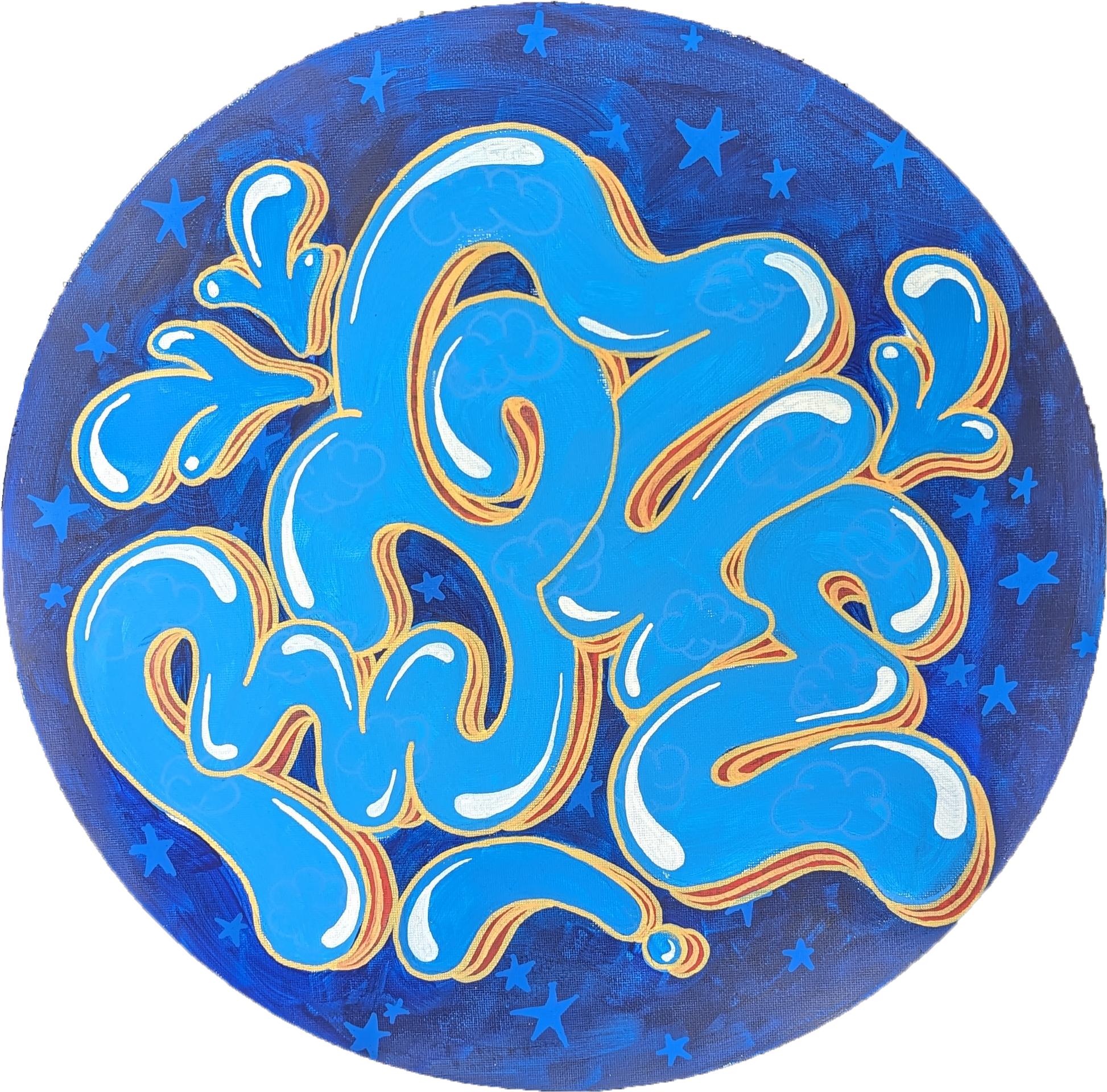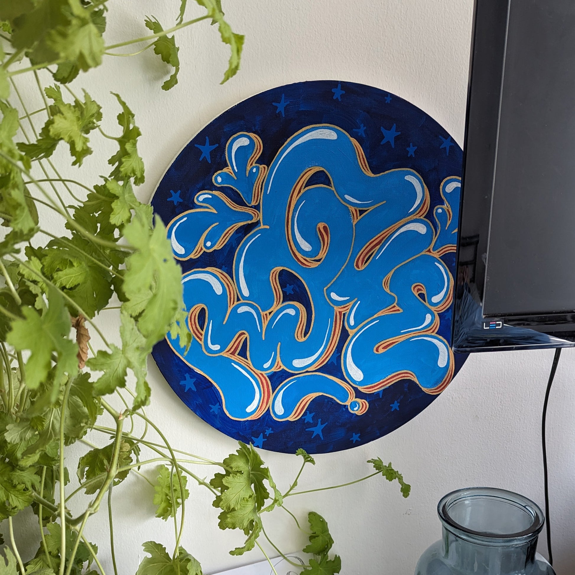 Here is your opportunity to own a one-off hand-made artwork. This art piece is made with acrylic paint on a round canvas, giving it a distinct texture and vibe. A true one-of-a-kind artwork, sure to become an eye-catching centrepiece for your home or workshop as well as an appreciating asset.
